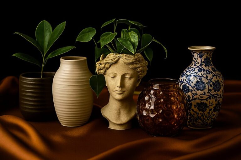 Hver vase og skjuler har sin egen karakter. Nogle er rå og rustikke, andre elegante og glatte. Vi udvælger dem med blik for form, farve og stemning – og hvordan de spiller sammen med planter, rum og lys. Her finder du ikke masseproduktion, men personlighed i keramik, glas og porcelæn.